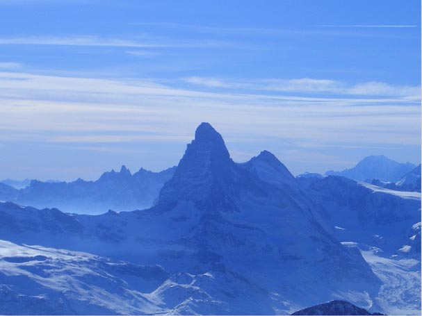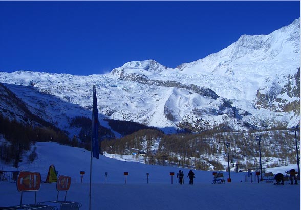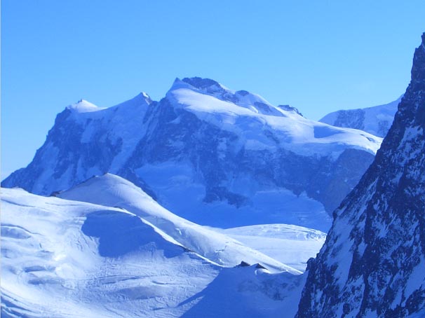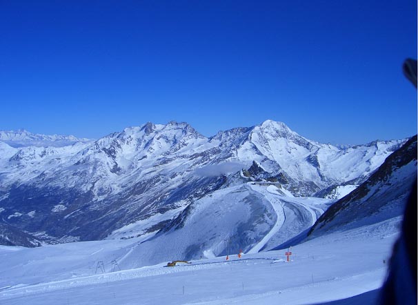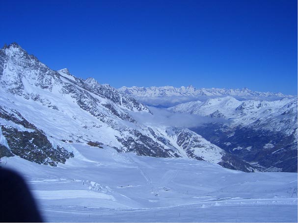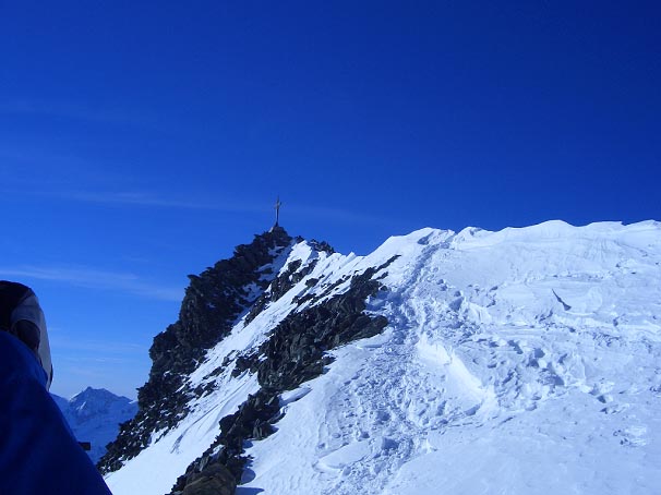 Trotz aller Mühen (o.k. Yak Seilbahnfahren macht keine Mühe, aber ich war wenigstens willig) es war es wieder wert. Wann hat man schon mal das Allalinhorn bei bestem Wetter für sich allein. Außer uns war nur noch ein Besteiger oben. Normalerweise muß ja schon in Saas Fee ne Nummer für die Reihenfolge der Besteigung ziehen. Also ich schätze, dieses Jahr müssen sie Treppenstufen ins Blankeis schlagen, damit im Sommer der Rubel und die Rudel rollen.