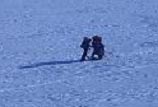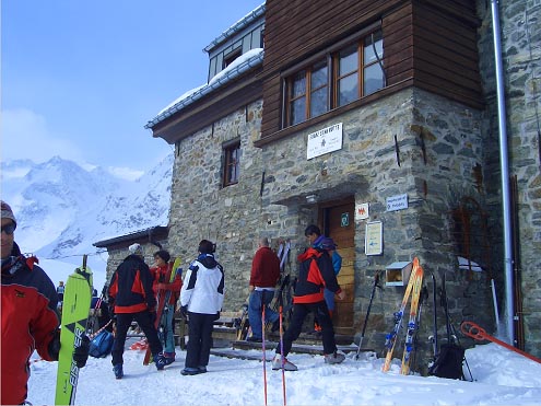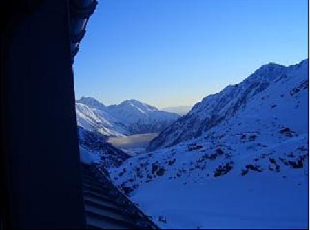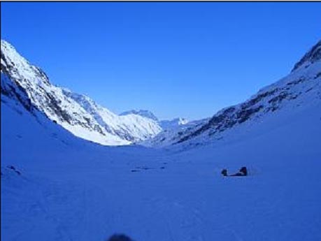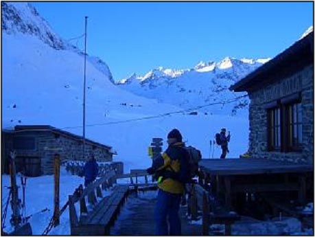 15:15 Innsbruck HBF. Geschafft und weiter geht es ins Stubai hinein nach Seduck. Ja, freitags kriegt man hier noch Parkplätze. Hektisch die Klamotten gewechselt und los geht’s. Ätsch Pickel und Schäufelchen vergessen und noch mal kurz umgedreht. Das kostet wieder ein Freibier. Und auf geht's gemütlich ansteigend zur Oberissalm. Uns kommt noch ein Skidoo entgegen und hinaus mit dem Daumen. Der hält auch prompt und verspricht, uns einzusammeln, nachdem er noch ein paar Gäste und Gepäck abgeholt hat. Hurra, das spart ne halbe Stunde. Ist zwar nicht by fair means aber was soll's. Saukalt und wackelig auf dem Teil, aber mit einbrechender Dämmerung sind wir an der Oberissalm und parat zum Aufstieg. Schnell noch die Stirnlampen rausgekramt, denn es soll nach Sektionsstil die Ankunft im Dunkeln stattfinden.