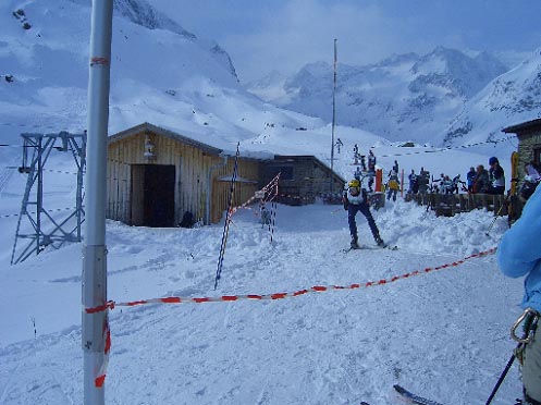 Ab 2.900 m brechen wir die Veranstaltung ab, es zieht ungemütlich zu und fängt an, bös zu schneien. Sicht 0. Gut, dass es die gewalzte , mit Tannenzweigen markierte Rennstrecke gibt. Mit meinem Fuß wäre ich durch keinen Tiefschnee mehr durchgekommen.