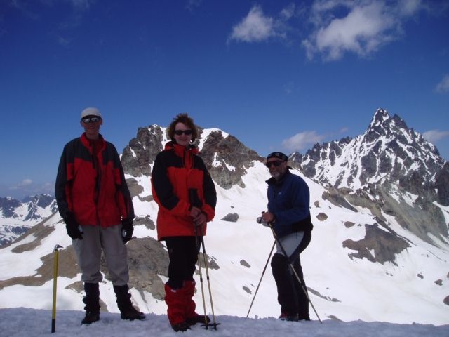 Am Montag geht es weiter zur oberen Ochsenscharte. Bernis "schneeschuhmäßige" Routenführung (Diretissima) findet nicht immer Franks Zustimmung: Regieanweisungen von hinten dirigieren uns dann in sanften Bögen die Scharte hoch. Martina kämpft mit der Luft - sollte die Rotweinallergie am Ende doch eine Erkältung sein? So bewacht Martina unser Rucksackdepot und wir spuren zu Dritt die letzten 200 Meterchen zur Dreiländerspitze hoch. Eine Kletterstelle erscheint unserem Führer wohl etwas zu schwierig, so wird kurz unterm Gipfel umgedreht. Schade, wenn auch die Aussicht durch die letzten Meter nicht mehr sehr viel besser geworden wäre ...