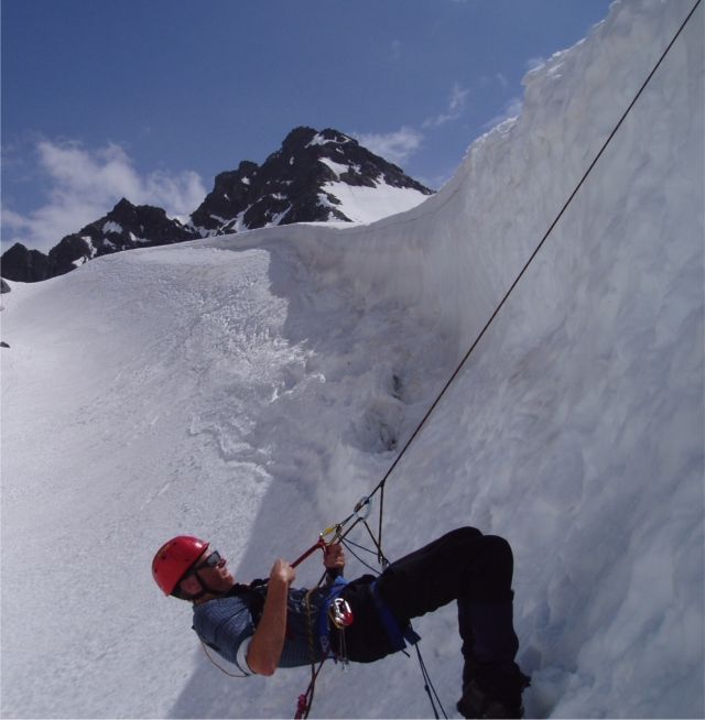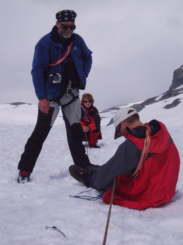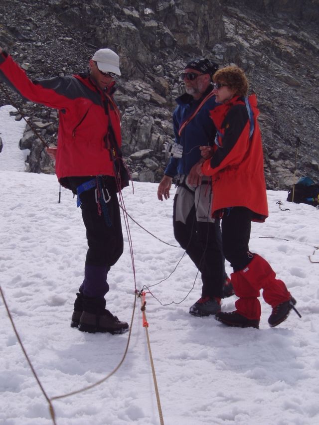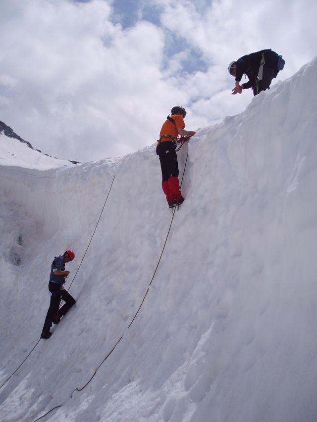 So gibt es denn am Dienstag auch wegen der angekündigten Gewitter statt der Erstürmung des Piz Buin ein gräßlich vernünftiges und dabei ausgesprochen nützliches Programm: Spaltenbergungsübungen.