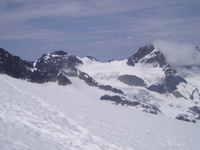 Über die Schneefelder des Vermuntgletschers rutschen wir knieschonend und schnell zur Wiesbadener Hütte hinunter. Dort können wir auch Uli, den "verlorenen Sohn" wieder in unsere Runde aufnehmen. Nach Stärkung durch üppige Brettljause und Strudel, die im Bauch noch weiter Jausen und Strudeln, noch ein kleiner Hupf auf die Grüne Kuppe, um den Ochsentaler Gletscher aus der Nähe zu bewundern.
