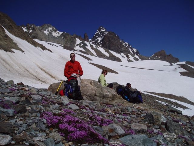 Am Samstag, den 03.07.2004 machen sich Berni und ich (= Dohle) von Ischgl aus auf den Weg, um Frank, Martina und Uli zur Silvretta-Tour zu treffen. Von Alex gewarnt was die quälende Länge und Öde des Hüttenanstiegs anbelangt, haben wir, ganz Weichei, die Strecke mit Hüttentaxi abgekürzt und starteten erst an der Bodenalpe, bei herrlichstem Föhnhimmel und Blick auf weiße Gipfel auf der fast ebenen Straße zur Heidelberger Hütte. Unsere Mitwanderer waren im Gastraum der Hütte schnell gefunden (Verrückte erkennen einander ;-)). Diese waren zur Rettung der Bergsteigerehre den Hüttenanstieg ungekürzt gelaufen (allerdings mit Gepäcktransport = Weicheier-Gleichstand ;-)).