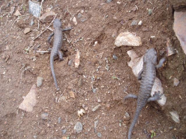 Mittwoch: Der Wettbericht droht mit Wetterverschlechterung von Südwesten, Schneefallgrenze weiter sinkend, Gewitter, ergiebige Schauer ... alles was Freude macht. Martinas Erkältung hat sich zwischenzeitlich ordentlich entwickelt und ihre Nachtruhe gewaltig gestört. Berni hingegen, aus dem "Männerkabuff" ausgezogen und in einsames Schlafstübchen nach oben gezogen, hatte eine erholsame, schnarch- und vibrationsfreie Nacht hinter sich :-). Nach einigem Überlegen entschlossen wir uns, nicht direkt in das schlechte Wetter hineinzulaufen, das sich im Südwesten sichtbar aufbaute und immer wieder über den Ochsentaler Gletscher zu uns herüberdrückte. Also Abstieg zum Silvretta-Stausee auf abwechslungs- und aussichtsreichem Wanderweg durch blaue Enzianwiesen, blühende Alpenrosen und vorbei an Alpensalamandern, die - im Gegensatz zu uns - das eintrübende feuchteWetter ganz großartig fanden und scharenweise hervorkamen.
