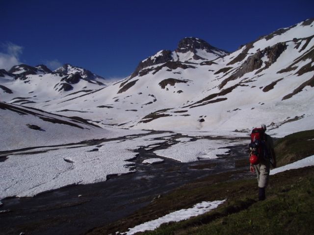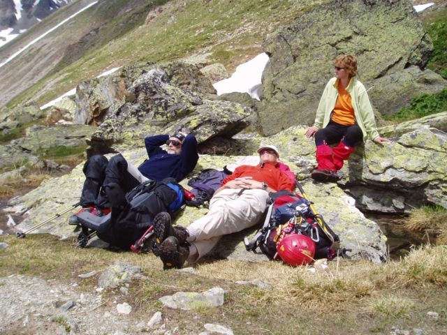 Der Abstieg zur Jamtal-Hütte ist im noch reichlich vorhandenen Schnee so schnell, dass wir uns am Finanzerstein in der Sonne legen müssen, um nicht zu früh zum Nachmittagskaffee zu kommen. Ein fettes Murmeltier läuft ganz ungeniert und geschäftig über eine Schneebrücke auf unsere Bachseite und unweit an uns vorbei.