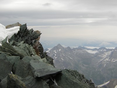 Oben gibt es nach all dem Firn einen Felsgipfel mit Gipfelrastplateau und einer Blockwerk-Gipfelpyramide mit Gipfelkreuz, die man nach Beweisfoto am besten sofort wieder verlässt, da höchstens 3 Leute sich dort drapieren können und alle Schlange stehen...