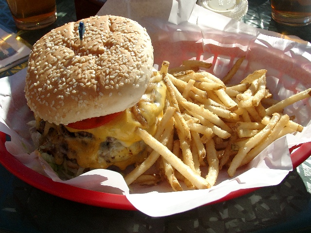 Auf der Speisekarte entdeckte ich dann Burger mit Pommes, aber ist das ein adäquater Ersatz? Natürlich nicht. Das ist, wie wenn man einen Sechstausender machen möchte und dann den Hirschberg bügelt. Zur Info, das ist übrigens schon die zweite Portion. Da meine Digital-Kamera eine Auslöseverzögerung von 0,7 Sekunden hat, konnten von der Ersten keine Aufnahmen gemacht werden.