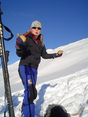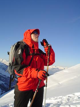 OK. Wir waren ja auf nem Lawinenkundekurs (stand ja auch so in der Kursausschreibung), also: Test der Reichweite der LVS-Geräte, Schneedeckenprofil, Beweis der Lawinenlageberichts, etc. Gerade hatten wir uns mit der den Gipfelerfolg bereits leicht bedrohenden Situation abgefunden, da geschah es. Drei gut gelaunte Gestalten (Alex, medl und Lars) mit Hund (Groggy) eilten uns entgegen, grüßten freundlich und stürmten weiter in Richtung Gipfel. Nein!!!! Und ich steh hier. Bombenwetter, feinster Powder, Lawinenwarnstufe II - und ich steh hier!!! Nichts gegen Lawinenkunde, ist ja alles wichtig und richtig und ich hab mich ja auch freiwillig zu dem Kurs angemeldet, aber doch nicht bei den Bedingungen, das konnte ja keiner ahnen. Ein scharfer Blick vom Hasei - ok, ich hör auf zu motzen und hör wieder zu …