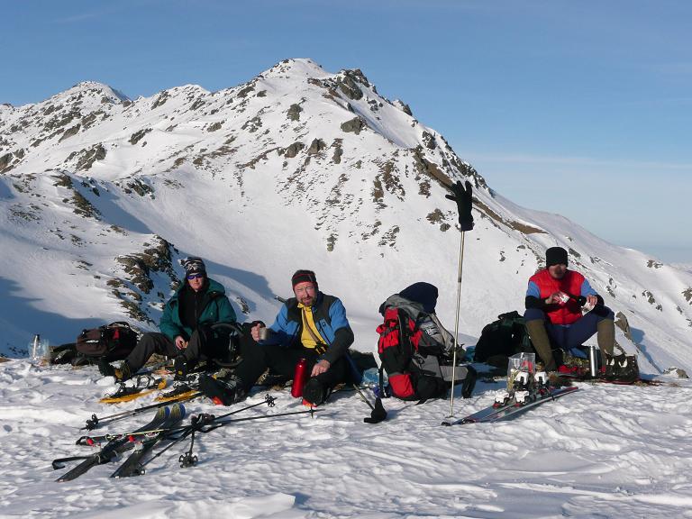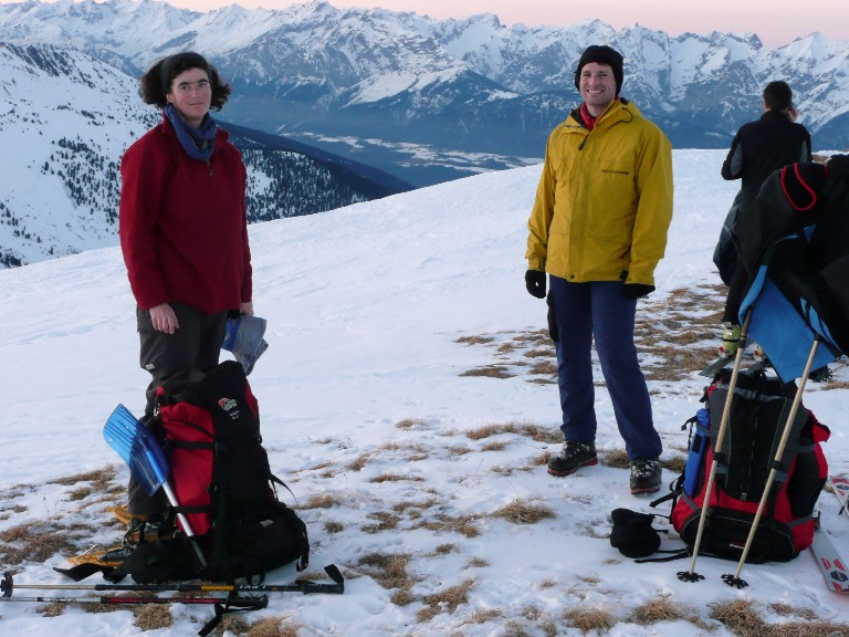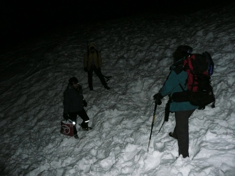 Endlich legen wir die letzten 200 Meter zum Gipfel zurück, Schneeschuhläufer und Skifahrer auf unterschiedlichen Wegen, jedoch erreichen wir alle vier den Gipfel rechtzeitig zum Beginn der astronomischen Dämmerung. Nach der obligatorischen fotographischen Dokumentation des Gipfelsieges geht es auf getrennten, aber einiger Maßen parallelen Wegen zurück zur Hütte- Anna und Lamπ™ auf Schneeschuhen, Hasei bringt dem Paul noch das Abfahren im Tiefschnee und bei Nacht bei.
