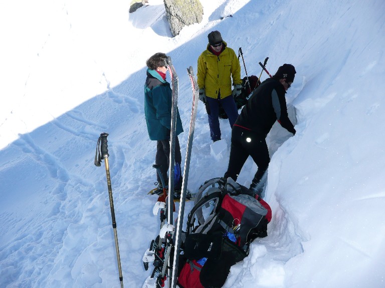 Am 27.12. geht es nach einer durchaus unbequemen Nacht im kalten und zugigen Lager mit defekter Heizung und einem wunderbaren Frühstück aus einem riesigen Büffet gegen 9 Uhr 30 auf Tour Richtung Nafingköpfl. Stellenweise sollen wir selbst spuren, an einer Stelle wird gezielt von der schon vorhandenen Spur abgewichen, weil eine Lawinenwarnstufe 1 (von 5) natürlich auch das Durchqueren von Rinnen ermöglicht, was bei höherer Lawinenwarnstufe i.d.R. mit dem Tode bestraft wird.
