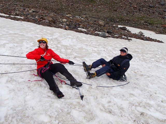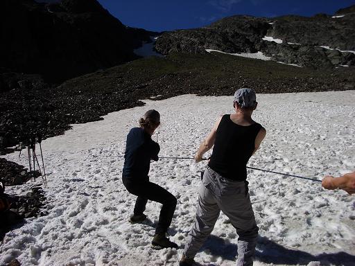 Wir vergraben also „Tote Männer“, lassen Karabiner durch die Schwerkraft „Alex“ in die „Spalte“ ab und retten und retten. Einen „echten“ Sturz verpasst uns Mike, als er sich auch für Alex überraschend fallen lässt. Nach fast 10m und kurz vor dem Ende des Firnfeldes bekommen wir Mädels den Sturz dann doch noch gebremst. Da jede Rettungsaktion beinahe eine halbe Stunde Zeit beansprucht, geht so der Tag recht bald dem Ende zu.