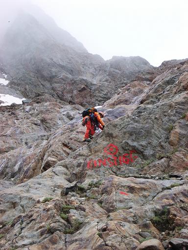 Dass die Gletscher nicht nur Gefahren durch die Spalten bergen wird uns auf unserem Weg zu unserem Pickeldepot klar. Hier und da hörten wir kleinere Felsstürze und auf dem Gletscher lagen schon einige „frische“ Brocken rum. Gekonnt suchten wir den optimalen Weg und waren bald an unserem Depot angelangt. Alex bereitet alles für die Spaltenbergung vor. Dann hieß es, wer will der erste sein. Klar dass hier Annette die Nase vorn hat. Die hat einfach vor nichts Angst. Der „Sturz“ war von Karin und mir kaum zu halten, gut dass Alex vorsorglich hintersicherte. Doch auch hier macht das Wetter nicht mehr mit. Mitten im Programm müssen wir abbrechen. Alex holt Annette aus der Spalte und dann hieß es hurtig zur Hütte. Mit wenigen Regentropfen bedacht erreichen wir diese.