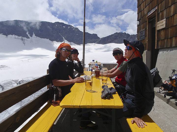 Besonders der Zustieg ist sehr steinschlagorientiert, wird mit Gewinn an Höhe aber immer weniger. Alex hat für den Steig die Führung übernommen und legt gekonnt das Fixseil. Die Hütte ist ein Traum, wie ein Adlerhorst, thronend über dem Übeltalferner und mit weiten Blicken. Das Pächterpaar (wir treffen zunächst nur die Heidi) sehr jung und unglaublich gut drauf. Dass Heidi nur noch ein Stück Kuchen über hat, den Alex abstaubt, stört nicht weiter. Denn der Kaiserschmarrn war auch sehr lecker. Die Aussicht dort ist unbeschreiblich und mit geschultem Auge hat wohl Alex ein neues Kursgelände ausgemacht (ganz sicher aber nicht für Anfänger).