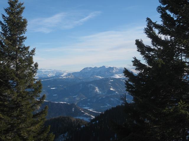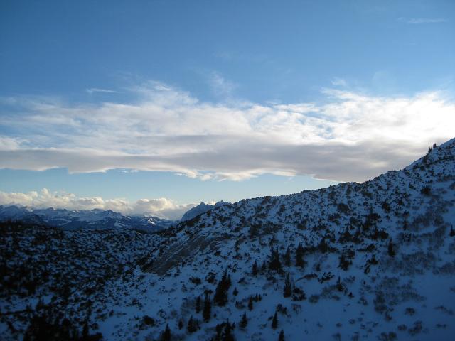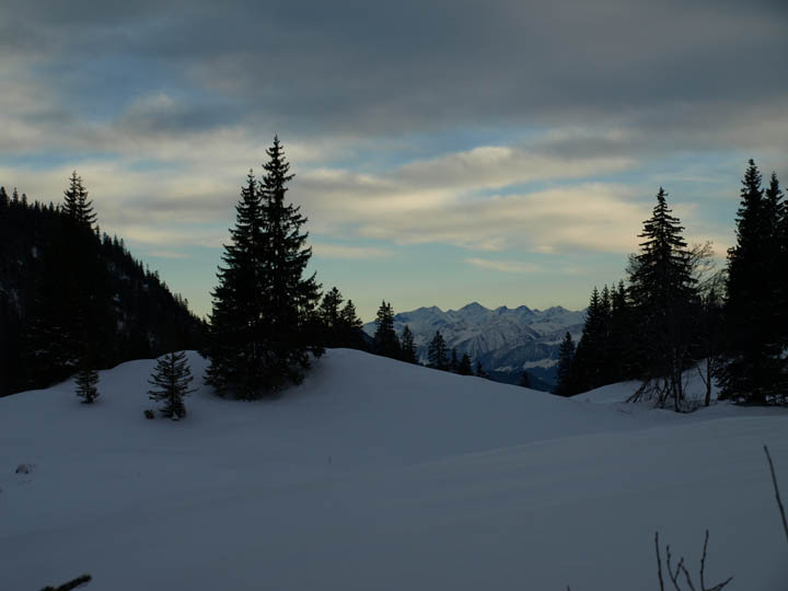 Irgend wann kam ich mal oben raus aus der Suppe Bislang waren die Schneeschuhe noch am Rucksack montiert. Aber für den Weg zur Dalsenalm brauche ich sie. Noch ein schneller Blick zurück zur K-Wand und dann einer Schispur folgend durch immer steileren Wald entlang an der hammerharten Hemmerwand nicht etwa zur Dalsenalm, sondern 200 m unterhalb in die Nähe von Schleching :( Also wieder 200 m hoch bis zum Abzw.Weitlahnerkopf. Hier kann ich noch mal an die Loreley denken doch dann: Nicht eine einzige Spur auf den Weitlahnerkopf. Jetzt, 16 Uhr 30 allein hochwühlen, nachdem es bereits im Ebenen kurz nach dem K-Wand-Haus so mühsam war? Also durch eine dunkle Schlucht zur Straße, wo ich innerhalb von 10 min. eine MfG zum Startpunkt kriege, von dort den Elendshatscher wieder hoch zur Hütte - zuerst glaube ich die 700 hm in 1 1/2 Stunde hinter mich zu kriegen, aber 8 km Strecke sind hier die entscheidende Größe. Der bei Tag vermutlich sterbenslangweilige Hatscher wird durch die im (Fast-noch-)Vollmondlicht leuchtenden Zacken der weiter entfernten Berge doch recht schön. |