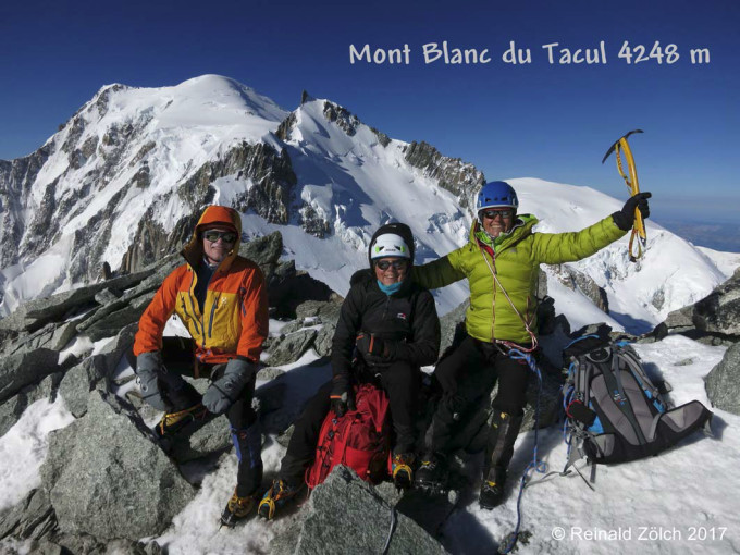 Geglückt ist uns die Überschreitung des Mont Blanc mit Anstieg über die so genannte „Drei Gipfel Route“, die Aiguille du Midi Mont Blanc Traverse, und Abstieg auf dem „Normalweg“, der Gouter Route. Die zeitsparenden Seilbahnhöhenmeter haben wir zwecks Höhenadaption ausgleichend auf zwei Tage ausgedehnt verteilt. Als Eingeh- und Erkundungstour diente die Besteigung des Mont Blanc du Tacul. Die Entscheidung für die realisierte Überschreitung ergab sich tagsdarauf erst auf dem Weg zum Mont Blanc Gipfel. War ein Abstieg über die Gouter-Hütte doch nur als Alternative vorgesehen.