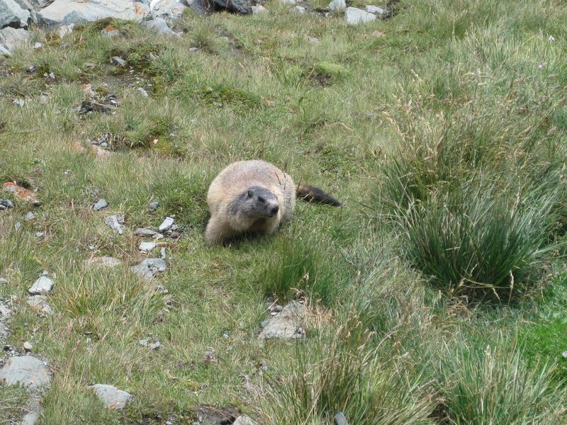 Von der Franz-Josefshöhe zieht der Sommerweg oberhalb der Pasterzenreste und parallel zu ihr Richtung NW zum Wasserfallwinkel. Begrüßt wurden wir, als wir am spätmittags dort eintrudelten, auf den Wiesen unterhalb der Parkplätze von etlichen Mankeis, die hier touristengewohnt sind. Bevor man Fels und Eis erreicht, muss man eine Art Geisterbahn durchqueren…
