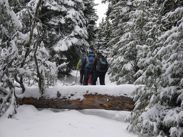 Egal: bald ist der Parkplatz erreicht, und es geht steil bergauf entlang des ehemaligen Sessellifts, der aber schon seit Jahren nicht mehr in Betrieb ist. Wir sind noch in Wanderschuhen unterwegs – aber ein Stück nach der Hütte Metschit zieht nach und nach einer nach dem anderen die Schneeschuhe an.