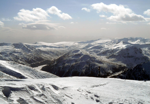 Nach einer ausgiebigen Pause zum Essen, zum Anfertigen des obligaten Gipfelfotos und natürlich zum ausgiebigen Genuss des herrlichen Panoramas sehen wir zu, dass wir in zwei Stunden wieder zurück zum Jastrebez kommen. Von der Hütte geht es so gut wie flach zurück zur Bergstation. Mittlerweile ist der Schatten an den Hang zurückgekehrt, so dass das Gehen im festen, nicht mehr an den Schneeschuhen klebenden Schnee jetzt deutlich weniger mühsam ist. Die Kabinenbahn bringt uns wieder nach unten. Im Tal ist der Frühling ausgebrochen - doch der soll nur wenige Stunden halten…