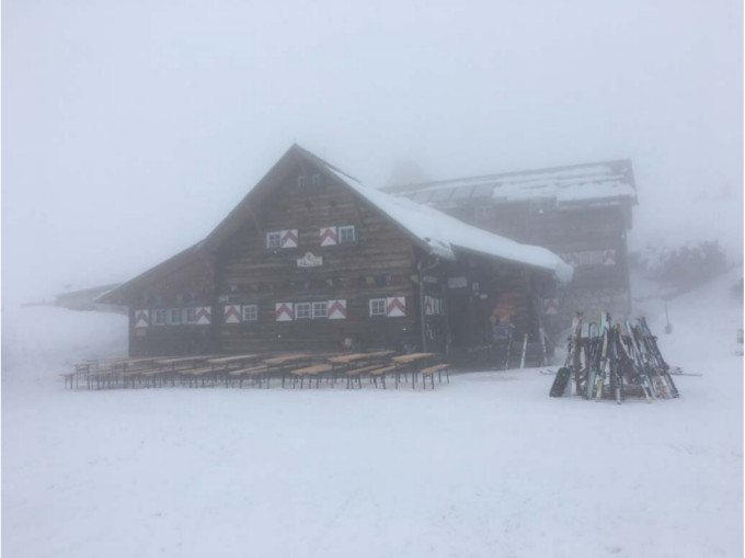 Der Aufstieg - von Reini sportlich mit 1,5 Stunden veranschlagt - brachte uns in 2,5 Stunden – geschuldet dem Spuren im frischen Pulverschnee - über eine Mulde mit blick auf die Autobahn (!), einen Forstweg und eine Alm in den Wald. Auf den letzten hundert Metern vor der Hütte mussten wir dann doch mal per GPS nachschauen, wo wir genau angekommen waren. Die Sicht war so gering geworden, dass wir nur noch „blind“ einer existierenden Spur folgten. Erst spät sahen wir auf der Karte, dass da direkt neben uns auch ein See sein musste. Nasse Füße bekamen wir aber glücklicherweise nicht. Die Hütte überraschte uns mit einem hervorragenden Halbpensions-Essen, war aber gut belegt. Um die 50 Gäste müssten es gewesen sein - es war Stimmung in der Bude.