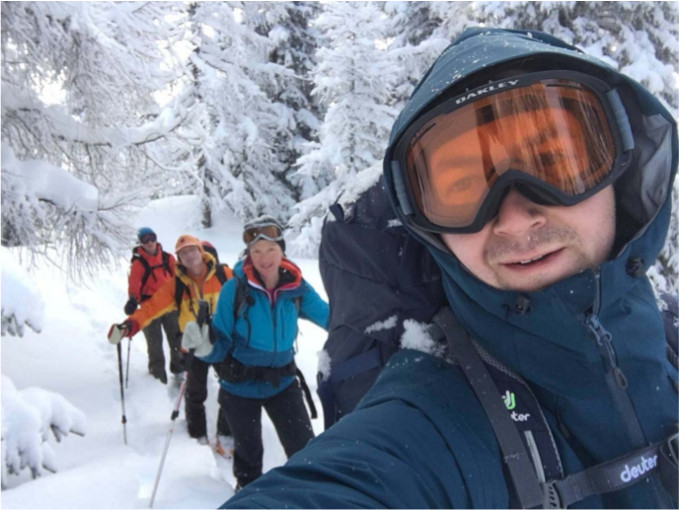 Das Spuren wurde zur kraftmäßigen Herausforderung: Neuschnee fast bis zu den Knien. Wir wechselten uns oft ab, jeder von uns fühlte sich wie ein großer Schneepflug, wenn er als erster der Gruppe lief. Einige lawinengefährdete Hänge überquerten wir einzeln, vorsichtig und zügig. Es folgten Traumabfahrten durch den Wald bei hervorragendem Pulverschnee.