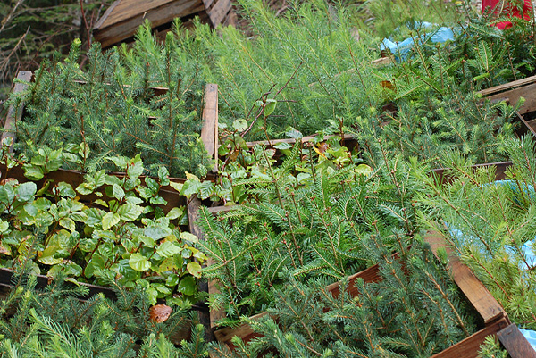 Umso überraschender, dass sich in dem Pflanzgut, das in Kisten für uns bereit steht, auch Fichten befinden.