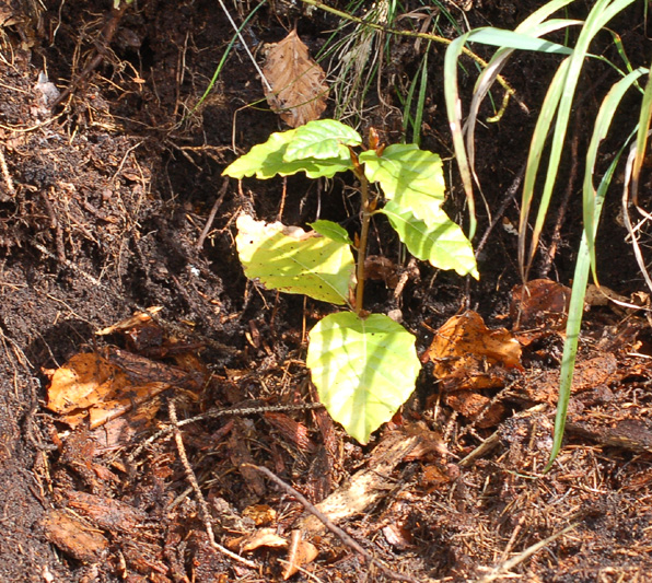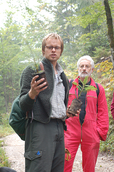 Warum das so ist, ist rasch erklärt. Bei der Auswahl der Pflanzen setzt man auf Altbewährtes, der Wald soll behutsam zu einem bunten Mischwald ‚umgebaut’ werden. Und in dem hat auch die Fichte ihren Platz, trotz der augenscheinlichen Sturmanfälligkeit. Fichte und Tanne sind nämlich, was den Lawinenschutz angeht, unübertroffen. Beide sind auch im Winter voll benadelt und sorgen dafür, dass der Schnee quasi mit zeitlicher Verzögerung zu Boden fällt. Zwar behält auch die Kiefer ihre Nadeln, allerdings hat sie vor allem im Alter längst keine so dichte und tiefreichende Krone wie Fichte und Tanne. Aber da könnte doch wenigstens die Fichte durch die Tanne ersetzt werden? Nicht ganz, denn die Tanne schmeckt einfach zu gut und ist damit dem winterlichen Wildverbiss besonders ausgeliefert. Das 4. Nadelgehölz im Bunde ist die Lärche, die zwar nur sommergrün ist, dafür sich aber in der Jugendphase durch ein besonders rasches Wachstum auszeichnet, schnell über das Gras hinausragt und gut den gleitenden Schneemaßen trotzen kann. Zu den 4 Nadelgehölzen kommt ein Laubgehölz: Die Buche. Kein Ahorn, keine Vogel- oder Mehlbeere? Auch das ist beim Gang über die Fläche schnell erklärt. Ahorn und Vogelbeeren finden sich auf den Sturmflächen sehr schnell natürlich ein. Wurden diese Pflanzen vor dem Sturm durch das dichte und dunkle Nadeldach der Fichten am Wachstum gehindert, so können sie nun durchstarten.