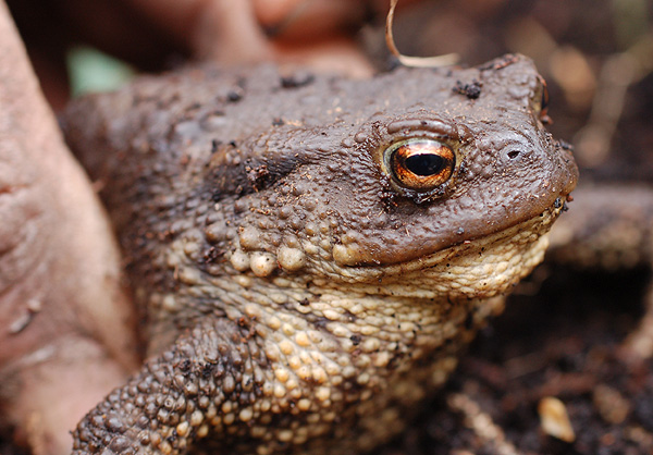 Als ich kurz Pflanzennachwuchs hole, macht sich ein für Scrat ungebetener Gast in einem Pflanzloch breit. Ihren Schreckensschrei kann ich zwar nicht hören aber gut vorstellen. Eine dicke Erdkröte hat sich ausgerechnet den auserwählten Platz für ihr Winterquartier ausgesucht. Jetzt muss sie leider umziehen.