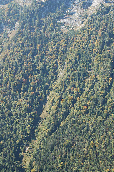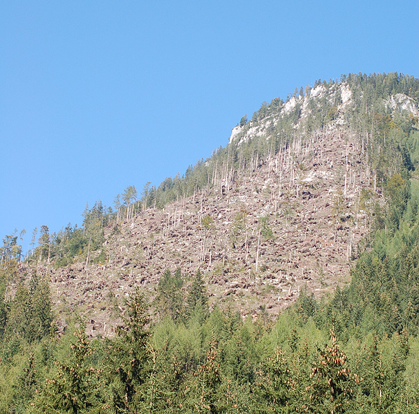 Grund für diese Arbeiten ist nun keineswegs originär der Bergwald, sondern die Schutzfunktion die ihm für die unten im Tal laufende Bundesstraße verbindet. Wäre ein durchgehender lawinensicherer Ausbau der Straße mit Tunneln und Galerien nicht um ein Vielfaches teuer, man hätte von Staats wegen keinen Cent in die Schutzwaldsanierung gesteckt. Man kann dies am gegenüberliegenden Hang sehr gut beobachten.