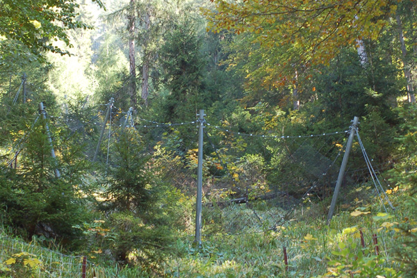 Eine ähnliche Funktion wie die Netze, erfüllen im licht werdenden Bergwald Böcke aus Hartholz,