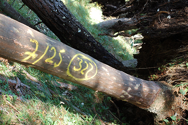 Nun geht´s los in die Wand. Auf dem breiten Wanderweg vorbei am Klettergarten, der vom Wasserwirtschaftsamt als Materiallager für die Lawinenverbauung genutzt wird, erreichen wir nach einer Viertelstunde unseren Einsatzort. Nur wenige Meter oberhalb des Wegs hat Kyrill zugeschlagen und großflächig den Waldbestand niedergemäht. Lediglich einzelne Buchen haben dem Sturm wenngleich nicht unbeschadet standgehalten. Die flachwurzelnde Fichte fiel ausnahmslos dem Sturm zum Opfer.