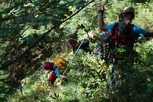 Der Abstieg erfolgt direkt neben einem der abgesicherten Lawinenstriche im Steilwald.