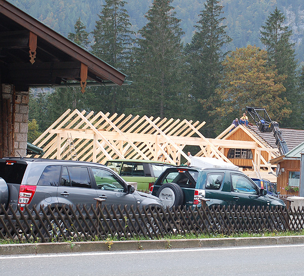 Drüben am Wachterl entstand gestern dieser Dachstuhl für die Erweiterung eines KFZ-Betriebes. Offensichtlich ist man dort guter Hoffnung, dass sich eine Sperrung wie in diesem Jahr nicht mehr wiederholen wird. Und dafür haben wir jetzt oben an der Wand die Bäume gepflanzt?