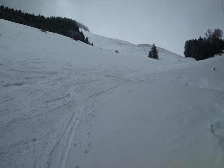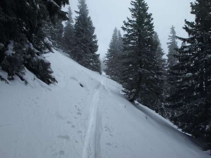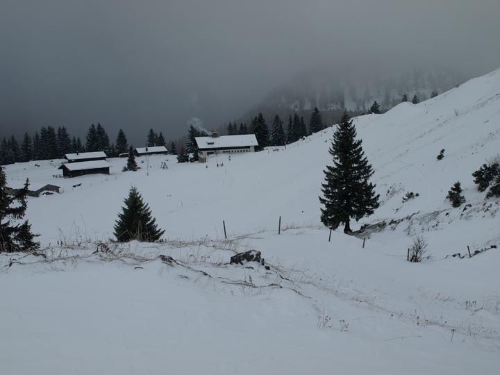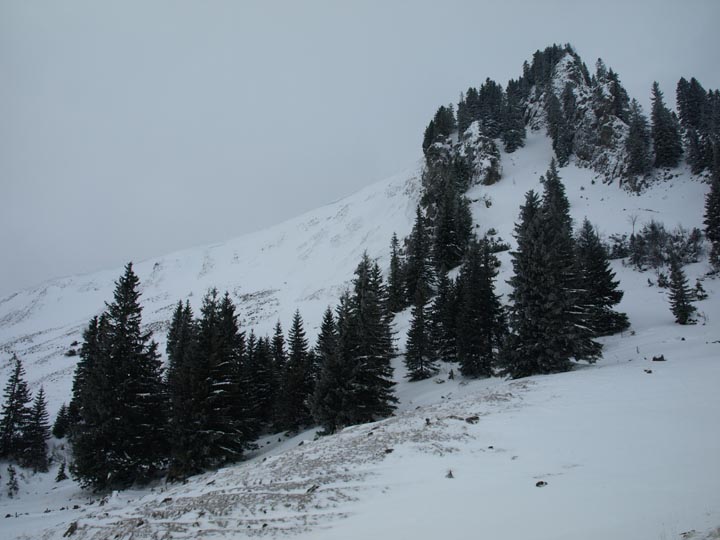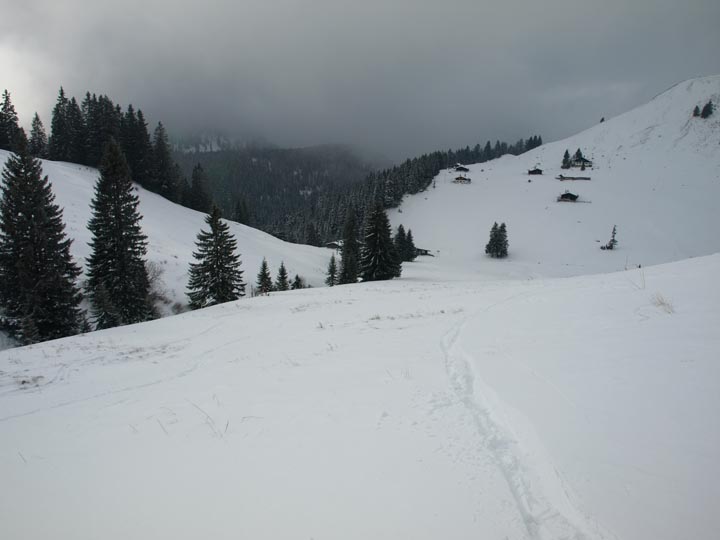Ausrüstung : Es liegt Schnee, nicht wenig aber auch nicht wahnsinnig viel. Stark verblasen ist er, in den Mulden richtig fetter Pauda, auf den Graten und Kuppen, alles freigeblasen, nicht ungewöhnlich würd ich mal sagen. Man findet genug Schnee für Skier, für die Jahreszeit würd ich die Bedingungen als ganz gut bezeichnen, aber ohne Schrammen wirds kaum abgehen, die nagelneuen Ski würd ich noch daheim lassen und die alten zerkratzen nehmen. Ohne alle Hilfen auf einen Gipfel zu wollen ist gewagt, denn man wird doch ein ums andere Mal sicher ganz schön tief im weißen Zeug drinstecken, also Schneeschuhe sind schon empfehlenswert.